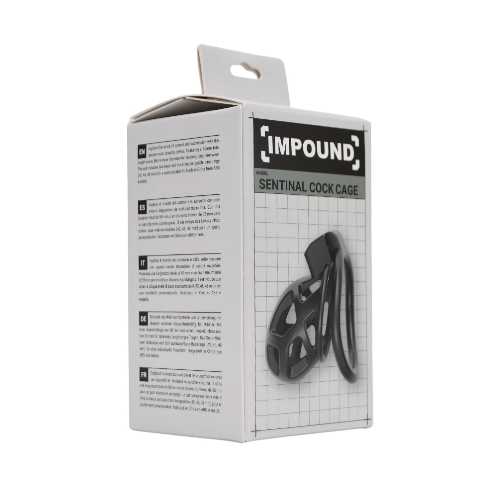 Slim, lightweight, and built for secure submission – the Impound Sentinel Cock Cage is designed for discreet chastity play without compromising on restraint. With a sleek and compact 80mm profile and an airy, open-vented structure, it’s ideal for long-term wear and hygiene. The 35mm inner diameter provides a snug fit, while three interchangeable base rings ensure maximum comfort and control. Made from ultra-light ABS with a touch of metal reinforcement, the Sentinel weighs just 28.5g – making it a perfect choice for beginners and pros alike. Features: